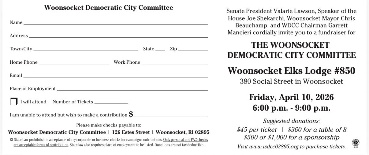 Tickets and sponsorships help fund voter outreach, candidate support, and community programs. RSVP by March 27. For tickets or questions, contact the Woonsocket Democratic City Committee.